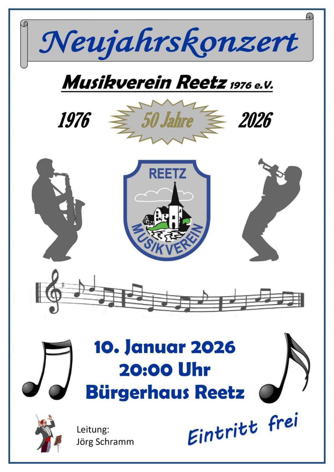 "In Reetz begrüßt man das Jahr mit jeder Menge Musik..." - denn dort findet am Samstag, 10. Januar 2026 um 20.00 Uhr im Bürgerhaus das traditionelle Neujahrskonzert statt, das diesmal ganz im Zeichen des 50jährigen Vereinsjubiläums steht. Das sollte man auf keinen Fall verpassen!