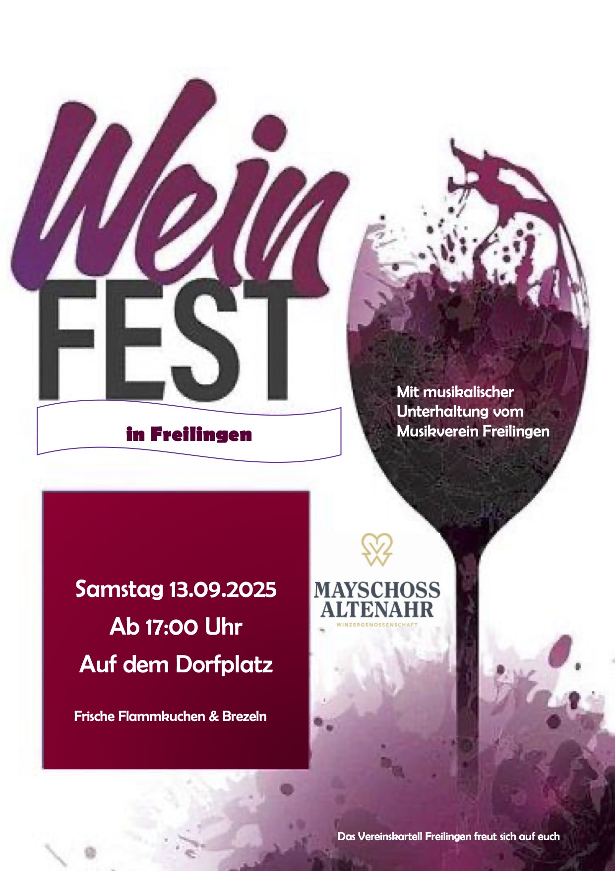 "Die Ahr kommt wieder nach Freilingen...", und zwar auf dem 4. Freilinger Weinfest, das am Samstag, 13. September ab 17.00 Uhr auf dem Dorfplatz gefeiert wird. Dann kann man wieder verschiedenste Sorten köstlichen Ahrweins und frisch gebackenen Flammkuchen in geselliger Runde bei musikalischer Unterhaltung durch den Musikverein Freilingen genießen. Nicht verpassen!
