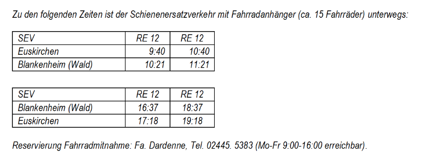 Der Radbus der Linien 844 ist am Veranstaltungstag als Shuttle von Rheinbach bis zum Bahnhof in Ahrbrück im Einsatz. Die Vorab-Reservierung wird empfohlen.