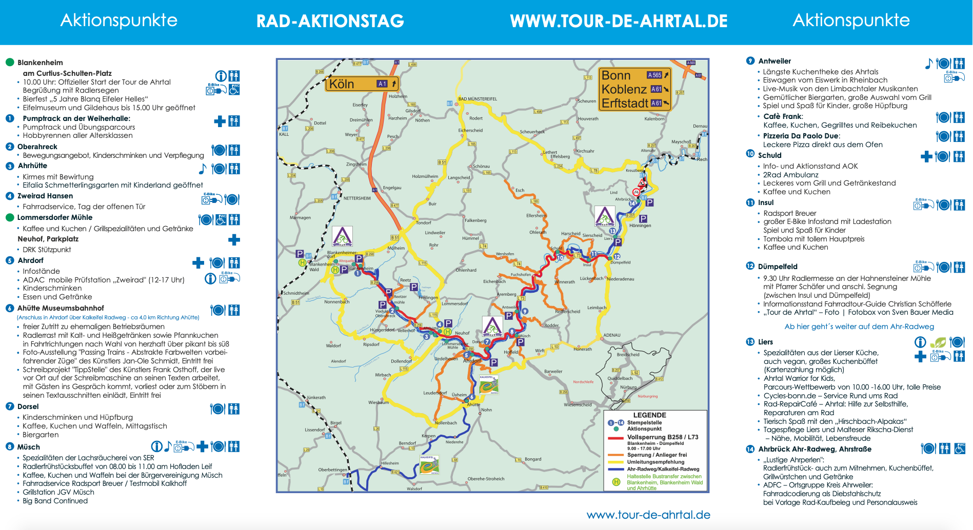 Entlang der Strecke sorgen auch diesmal 14 Aktionspunkte für Abwechslung, Unterhaltung und Stärkung. Ob Infostände, Mitmachaktionen, kulinarische Angebote, Fahrrad-Codierung oder Pannenservice – es ist für jeden etwas dabei (weitere Infos zum Programm unter folgendem Link: Flyer Tour de Ahrtal 2026)