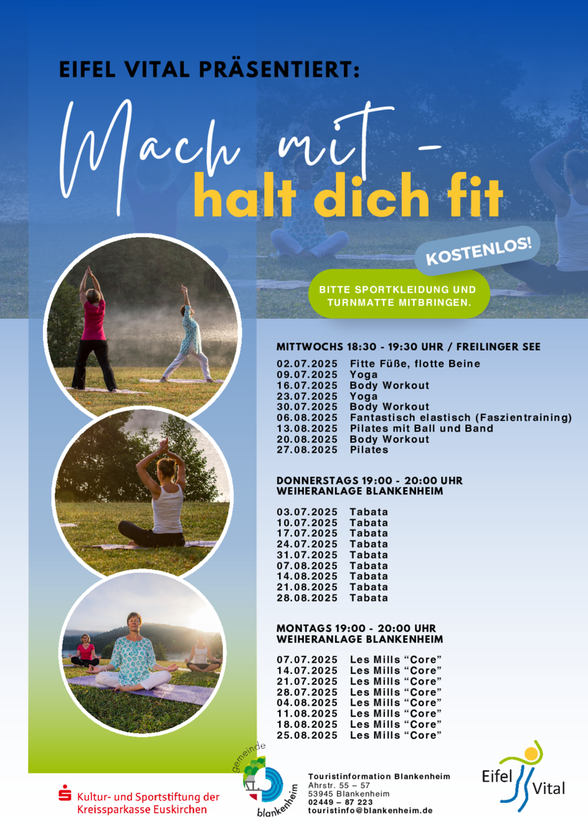 "Mach mit - halt dich fit" - so lautet auch 2025 wieder das Motto der Fitness-Kurse, die "Eifel Vital" im Julli und August abends am Freilinger See und an der Blankenheimer Weiheranlage anbietet. Das kostenlose einstündige Sport-Programm an den idyllischen Gewässern hat dabei für jeden etwas zu bieten und kann ohne Anmeldung genutzt werden. Nicht verpassen!