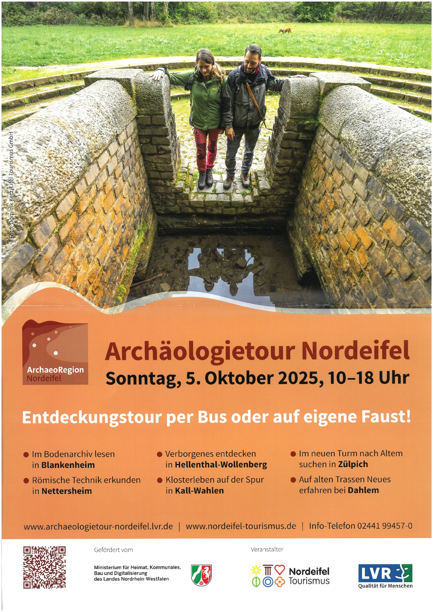 "Eine archöologische Rundreise"... durch unsere Region kann man am Sonntag, den 5. Oktober erleben. Der Landschaftsverband Rheinland, die Nordeifel Tourismus GmbH und die Kommunen im Kreis Euskirchen laden zur 18. Archäologietour durch die Nordeifel ein, bei der man spannende Einblicke in die Erdgeschichte und das Leben unserer Vorfahren geboten bekommt.