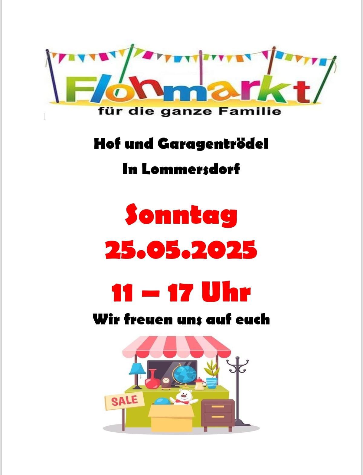 "Es wird getrödelt..."- in Lommersdorf findet am Sonntag, 25. Mai zwischen 11.00 und 17.00 Uhr ein Hof- und Garagentrödel statt. 17 Haushalte beteiligen sich an dieser Veranstaltung, so dass für jeden Flohmarktliebhaber etwas dabei sein sollte. Hier eine Übersicht über die Teilnehmer zum Ausdrucken!
