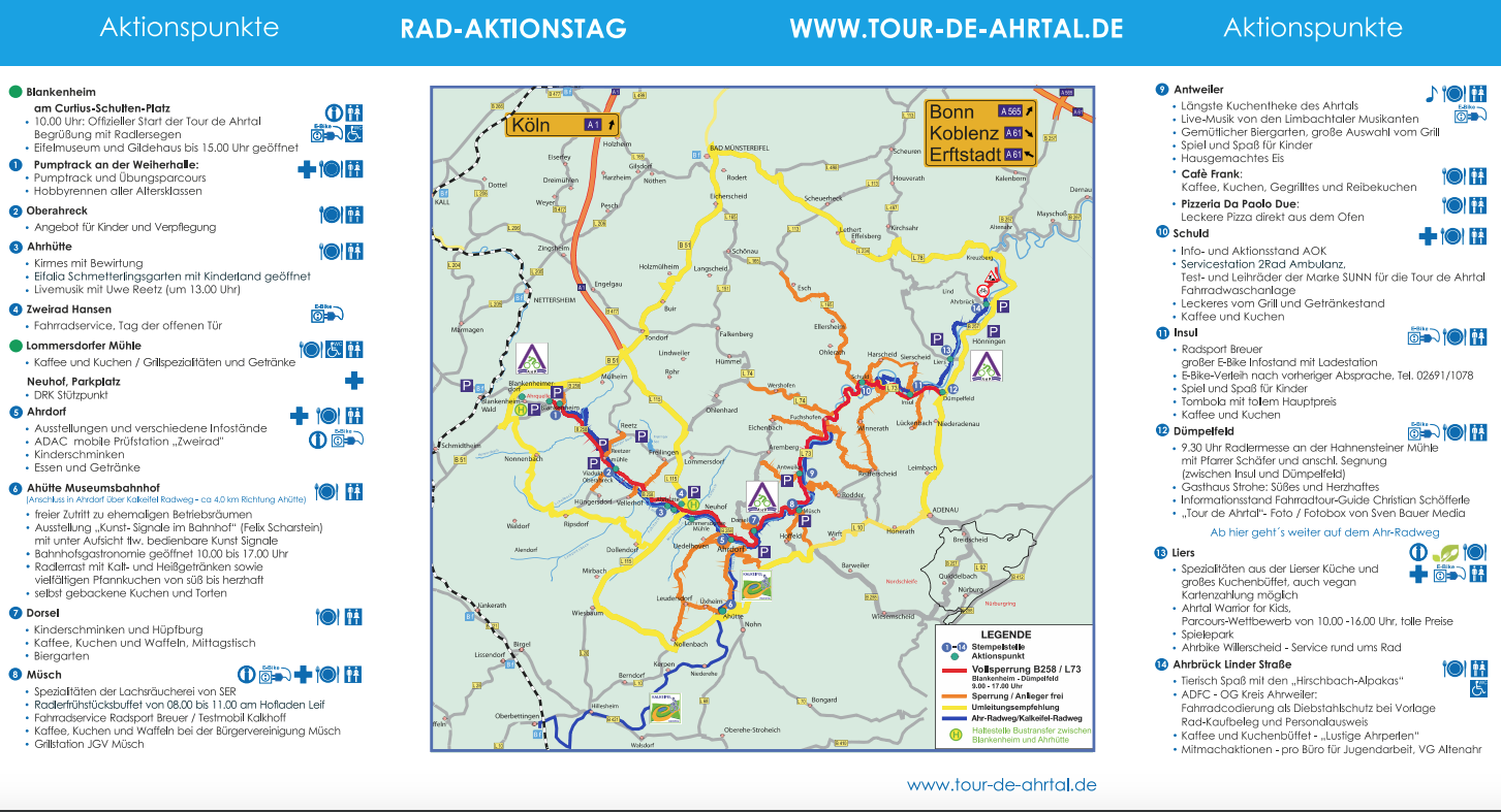 Entlang der Strecke sorgen auch diesmal 14 Aktionspunkte für Abwechslung, Unterhaltung und Stärkung. Ob Infostände, Mitmachaktionen, kulinarische Angebote, Fahrrad-Codierung oder Pannenservice – es ist für jeden etwas dabei (weitere Infos zum Programm unter folgendem Link: Flyer Tour de Ahrtal 2025)