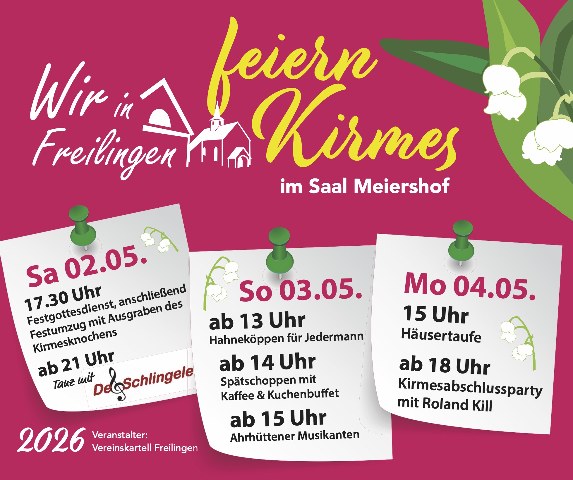"Wir feiern Kirmes" - Auch in diesem Jahr freut sich das Vereinskartell Freilingen wieder darauf, gemeinsam mit vielen Gästen und der gesamten Dorfbevölkerung vom 2. bis 4. Mai die traditionelle Kirmes zu feiern. Hier eine Übersicht, was an den Kirmestagen geboten wird. Nicht verpassen!