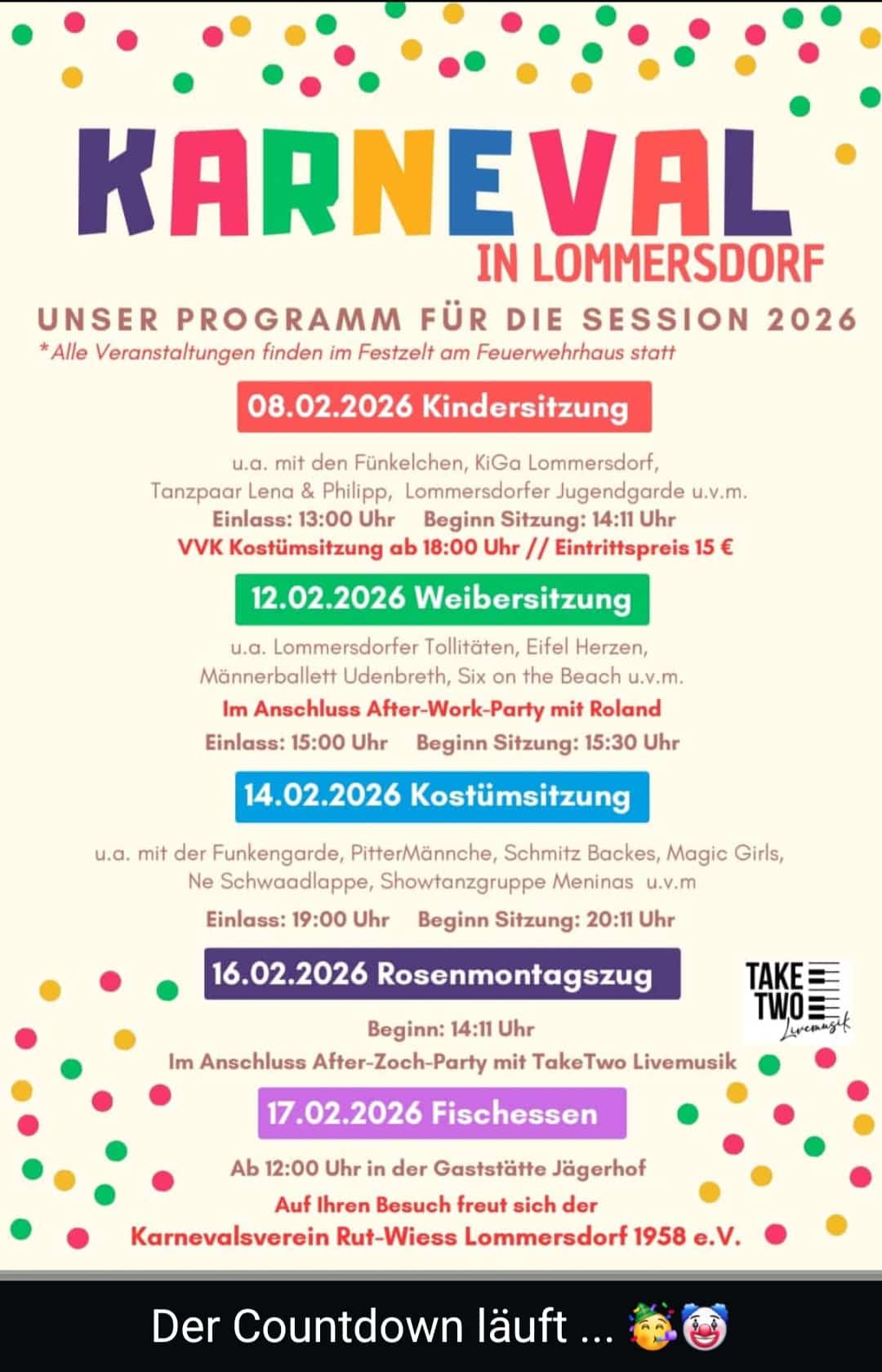 Montags, 16. Februar 2026 zieht ab 14.11 Uhr dann wie immer der Rosenmontagszug durch die Straßen von Lommersdorf. Anschließend wird im Festzelt am Feuerwehrhaus auf der "After-Zoch-Party" wie in jedem Jahr kräftig weiter gefeiert, diesmal mit Live-Musik und Stimmung von "Take Two".