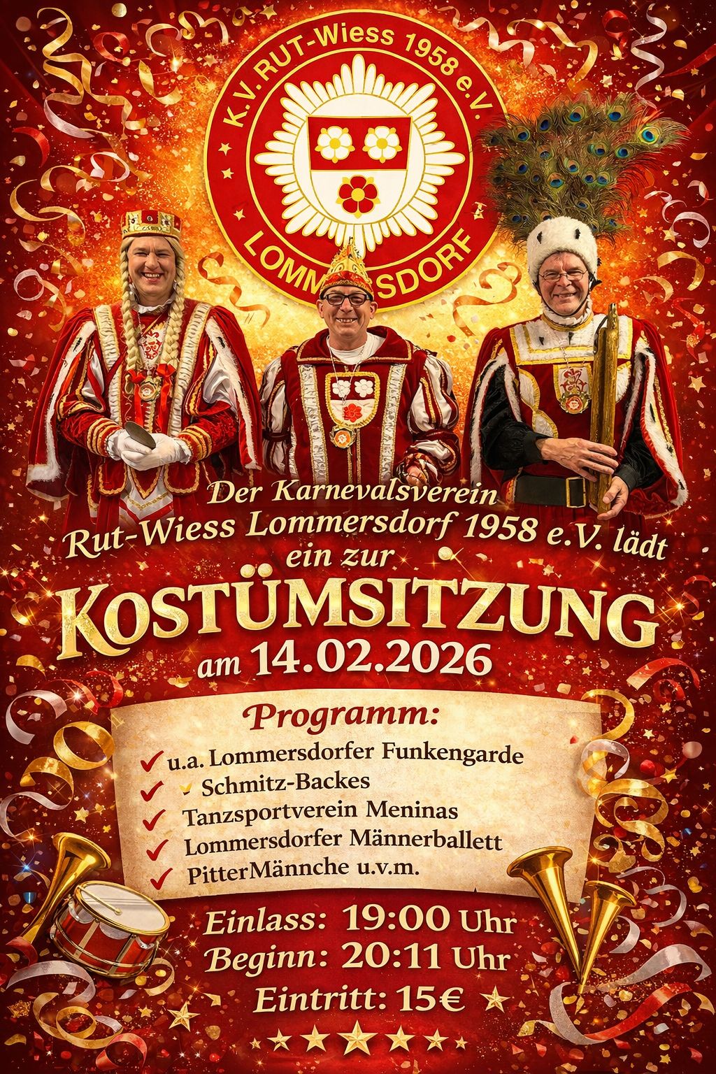 Gestartet wird das tolle Treiben wie immer mit der Kindersitzung, die am Sonntag, 8. Februar 2026 um 14.11 Uhr beste Unterhaltung speziell für die kleinen Nachwuchsjecken bietet. Damit wird dann auch der diesjährige Karneval, angführt vom Lommersdorfer Dreigestirn im Ausweich-Quartier "Festzelt am Feuerwehrhaus" offiziell eröffnet. Ab 18.00 Uhr staret an diesem Tag auch der Kartenvorverkauf für die Kostümsitzung