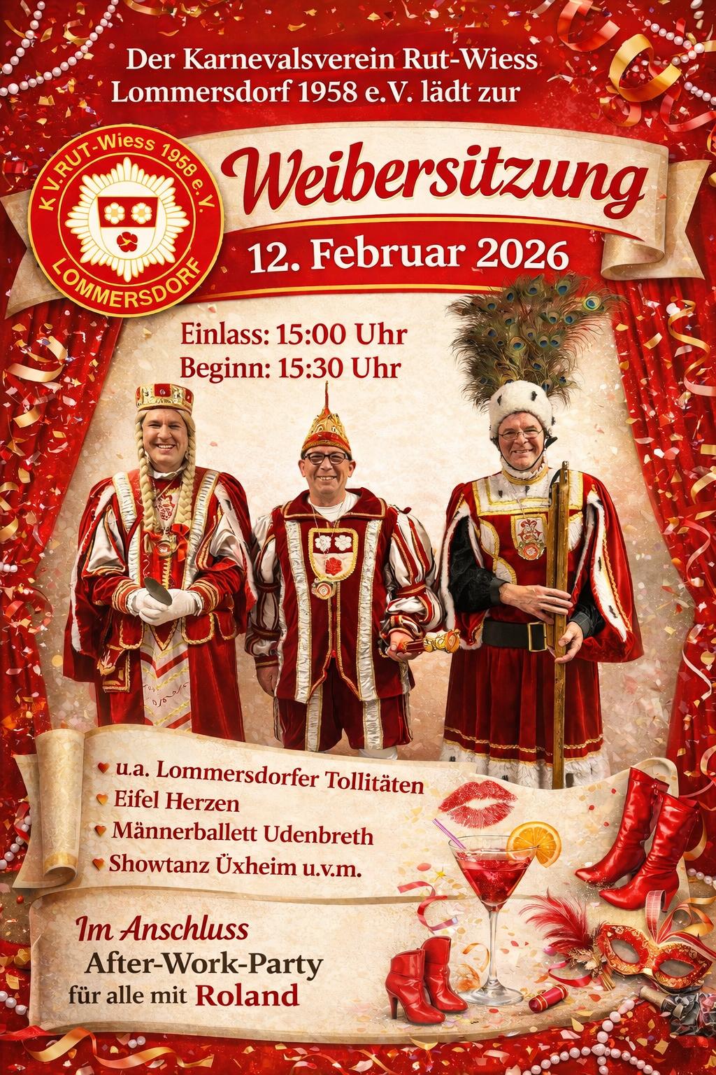 Am Weiberdonnerstag, 12. Februar 2026 können sich die "Möhnen" dann ab 15.30 Uhr (Einlass 15.00 Uhr) bei Kaffee und Kuchen auf der Möhnensitzung amüsieren und anschließend auf der "After-Work-Party" das Tanzbein schwingen, wenn "Roland" für die passende Musik sorgt.