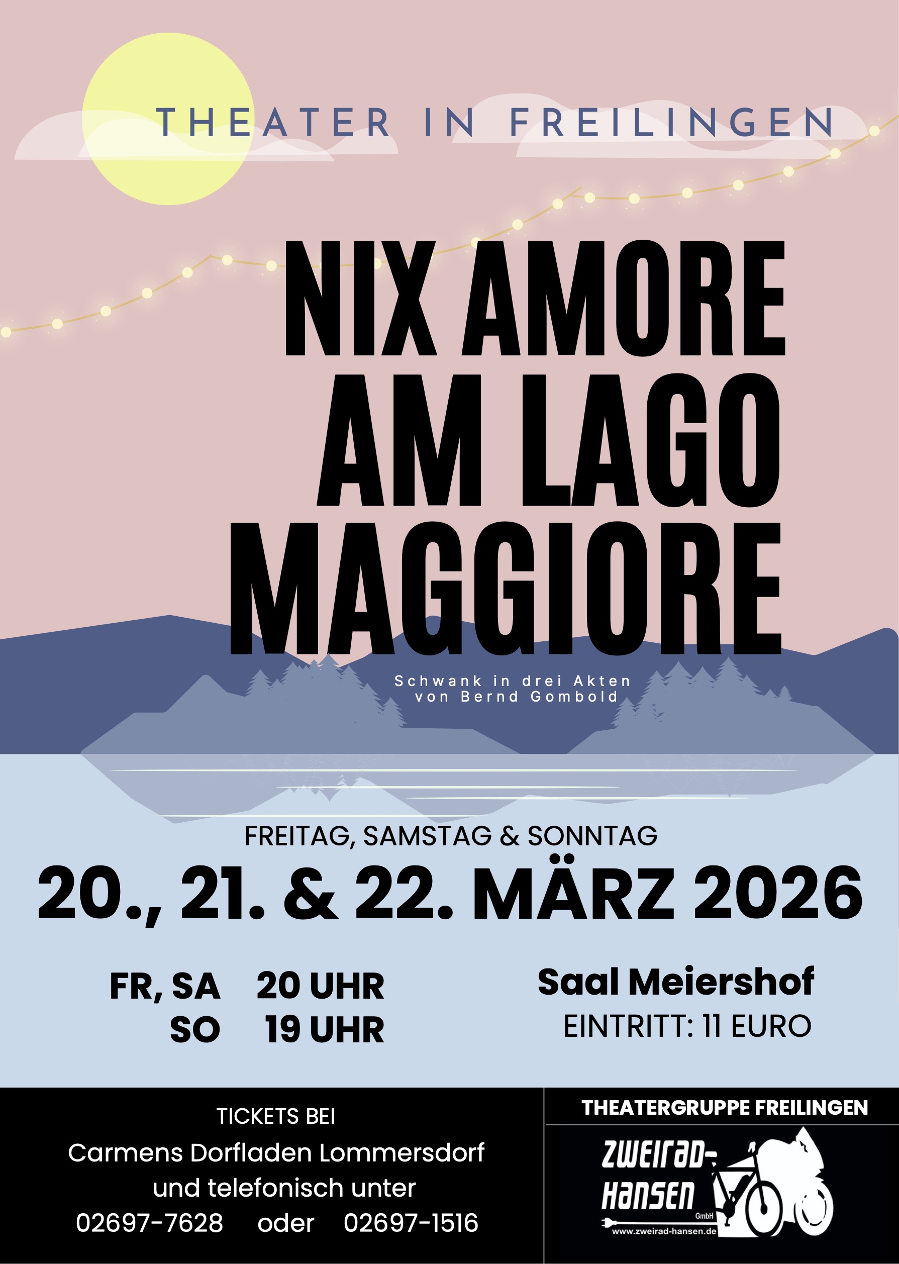 "Nix amore am Lago Maggiore" ....Auch 2026 können sich alle Theaterfreunde wieder auf eine Aufführung der Theatergruppe des Vereins für Brauchtum und Kultur in Freilingen am 20, 21. und 22. März 2026 im Saal von Meiershof freuen. In diesem Jahr sorgt ein "generationsübergreifendes" Ensemble für beste Unterhaltung mit einer turbulenten Urlaubskomödie. Jetzt Karten im Vorverkauf besorgen!
