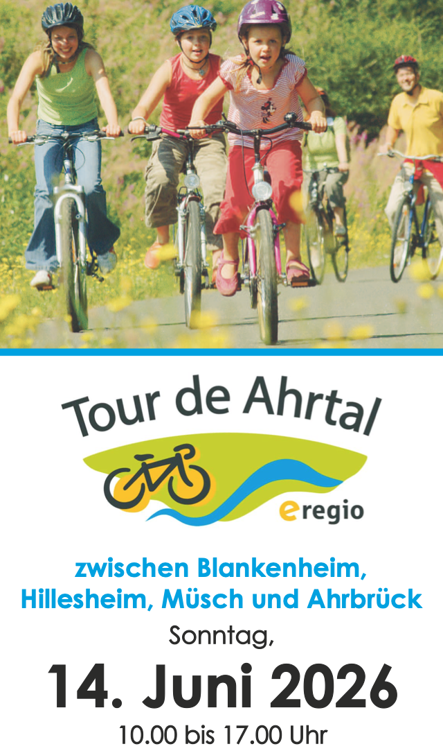 „Freie Fahrt für alle Radbegeisterten..." heißt es wieder am Sonntag, den 14. Juni 2026 zwischen Blankenheim, Hillesheim, Müsch und Ahrbrück. Beim beliebten Radaktionstag „Tour de Ahrtal“ laden die Kreise und Gemeinden im Ahrtal und in der nördlichen Vulkaneifel erneut zu einem besonderen Erlebnis für die ganze Familie ein. Am 16. April wurde das diesjährige Programm offiziell vorgestellt. Auch diesmal ist für jeden etwas dabei. Termin unbedingt vormerken!