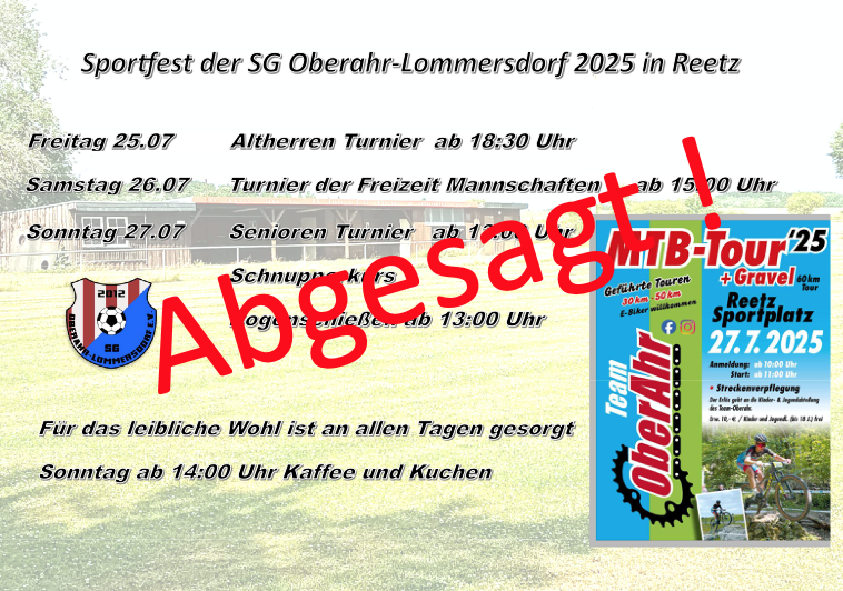 Abgesagt ! - Leider ist das diesjährige Sportfest des SG Oberahr-Lommersdorf, das eigentlich vom 25. bis 27. Juli auf dem Sportplatz in Reetz stattfinden sollte, abgesagt worden. Die Anmeldungen von Mannschaften für das Altherren- und Freizeitmannschaften Turnier waren zu gering. Die MTB-Radtour am 27. Juli findet allerdings statt.
