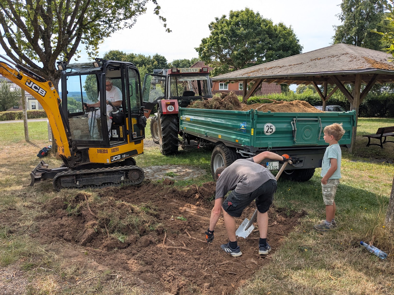Quasi in einer Familienaktion bereiteten Siegfried Bonzelet ( 2. Vorsitzender) mit Schwiegersohn Markus Birk (Vorsitzender des Dorfvereins) und dem "aufsichtführenden" Enkel Jonanthan sowie Hubert Schneider (Kassierer) mit Schwiegerson Gaetano Di Bernardo (Schriftführer) die Stellfläche vor, auf der Bänke und Tische verankert wurden. Die Garnitur war u.a. mit Mitteln aus dem "Windkraft-Spendentopf" der Gemeinde finanziert worden, die der Dorfverein im letzten Jahr zugewendet bekommen hatte.