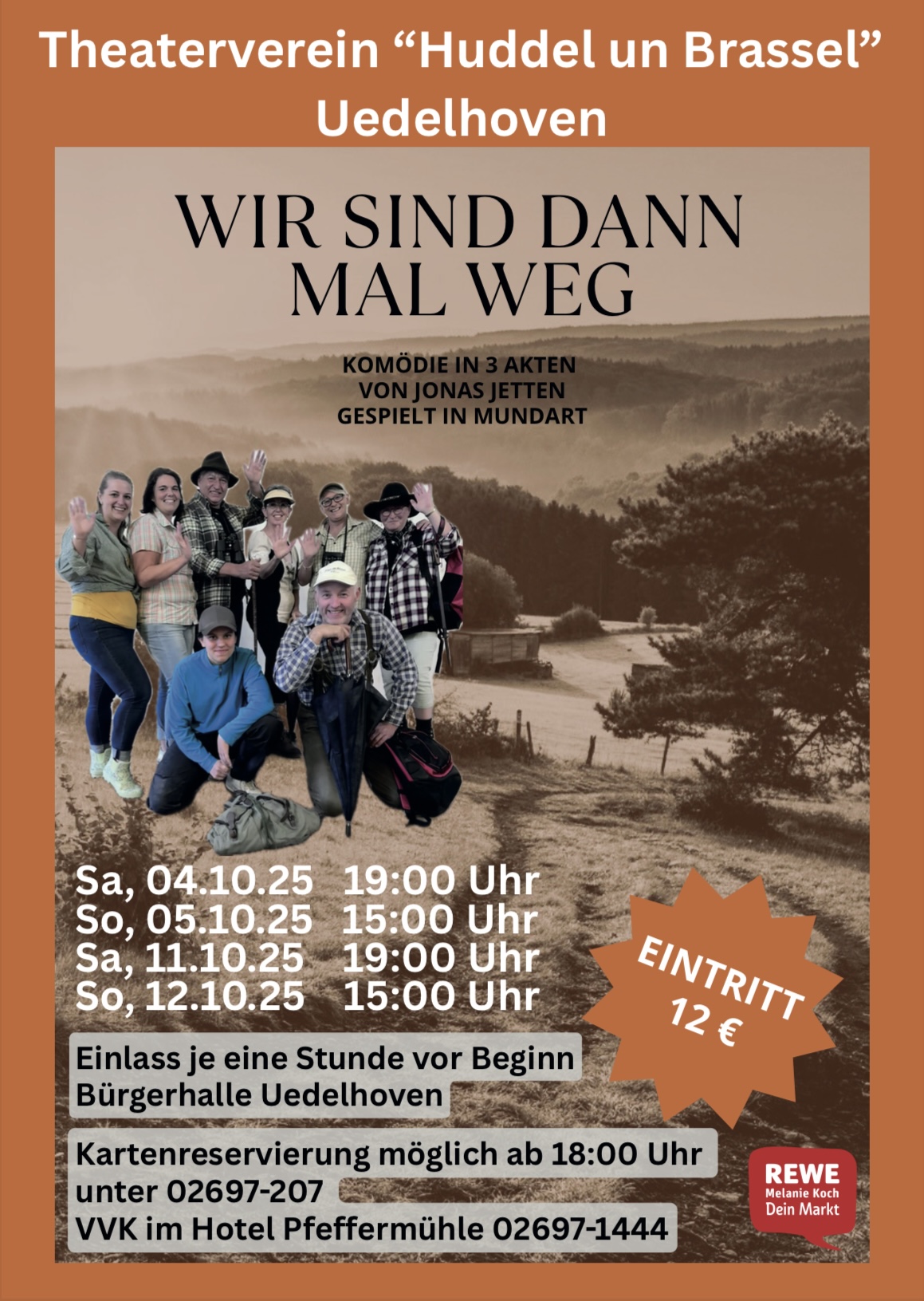 So können sich an den ersten beiden Wochenenden im Oktober die Theaterfreunde dann auch beim Theaterverein "Huddel un Brassel" in Uedelhoven amüsieren, der die Komödie in drei Akten "Wir sind dann mal weg" von Jonas Jetten zur Aufführung bringt, und das wie gewohnt auf Platt.