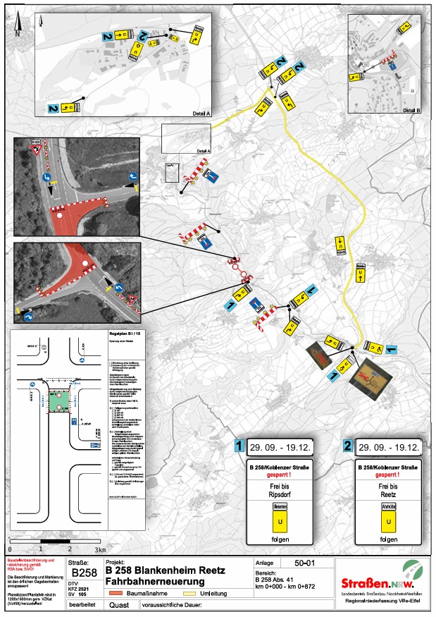 "Vollständig gesperrt"...wird die Ahrstraße (B258) ab dem 29. September bis voraussichtlich Ende des Jahres (19. Dezember) zwischen dem Abzweig Reetz und dem Abzweig Ripsdorf aufgrund einer Baumaßnahme des Landesbetriebs Straßen.NRW. Der Fahrbahnabschnitt soll durch die Firma Backes umfassend saniert werden, womit die Sanierungsarbeiten dann auch abgeschlossen wären. Entsprechende Umleitungen sind ausgeschildert. Bitte beachten!