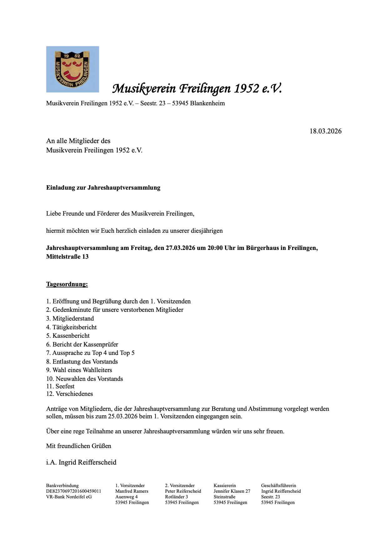 "Neuwahlen"...stehen am Freitag, 27. März 2026 auf der Jahreshauptversammlung des Musikvereins Freilingen um 20.00 Uhr im Bürgerhaus unter anderem auf der Tagesordnung. Dazu lädt der Vorstand alle Mitglieder, Freunde und Förderer ganz herzlich ein.