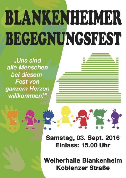 "Uns sind alle Menschen bei diesem Fest von ganzem Herzen willkommen"... so heißt es auf der offiziellen Einladung zum Blankenheimer Begegnungsfest am Samstag, 3. September 2016 in der Weiherhalle, das vom Förderverein "Vielfalt Leben im Kreis Euskirchen e.V." organisiert und vom Vereinskartell Blankenheim und der Gemeinde Blankenheim unterstützt wird.