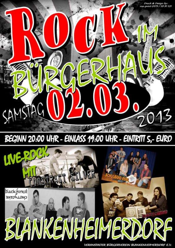 Am Samstag, den 02. März 2013, ist es soweit! Wie im letzten Jahr veranstaltet der Bürgerverein Blankenheimerdorf „Rock im Bürgerhaus"!