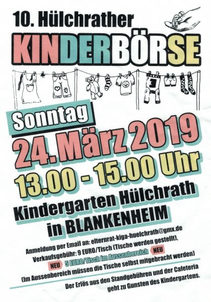 "Schnäppchenjäger aufgepasst!" - bereits zum 10. Mal veranstaltet der katholische Kindergarten Hülchrath in Blankenheim am Sonntag, 24. März eine Kinderbörse. Wer sich nicht nur nach Schnäppchen umschauen, sondern selber verkaufen möchte, hat jetzt noch Gelegenheit, sich anzumelden!