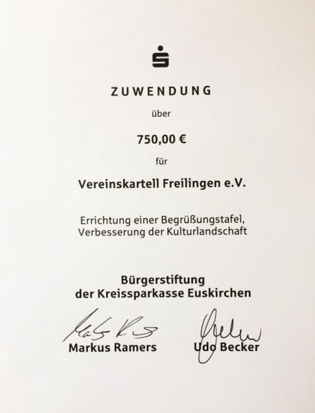 Eine erfreuliche Nachricht für das Vereinskartell Freilingen... aufgrund eines Anfang des Jahres gestellten Antrages hat die Bürgerstiftung der Kreissparkasse Euskirchen dem Vereinskartell einen Betrag von 750 € zugesprochen. Die Mittel sollen für die Anschaffung der zweiten Ortseingangstafel verwendet werden.