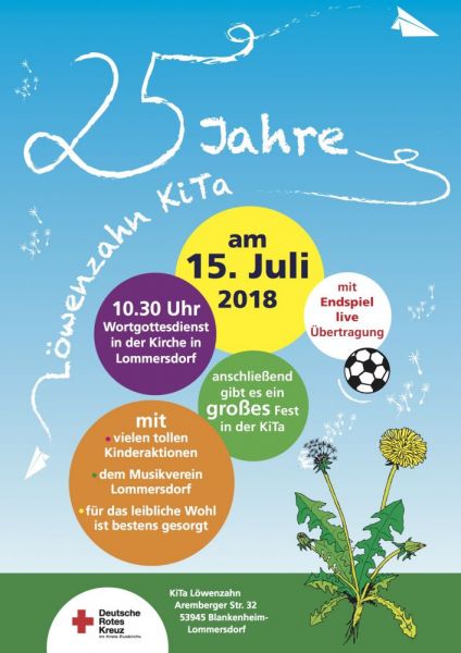 Kaum zu glauben, aber die KiTa Lommersdorf wird tatsächlich schon 25 Jahre alt...und ein solcher "Geburtstag" muss natürlich gefeiert werden. Deshalb findet am Sonntag, 15. Juli 2018 ein großes Jubiläumsfest statt, bei dem allerhand geboten wird. Nicht verpassen!