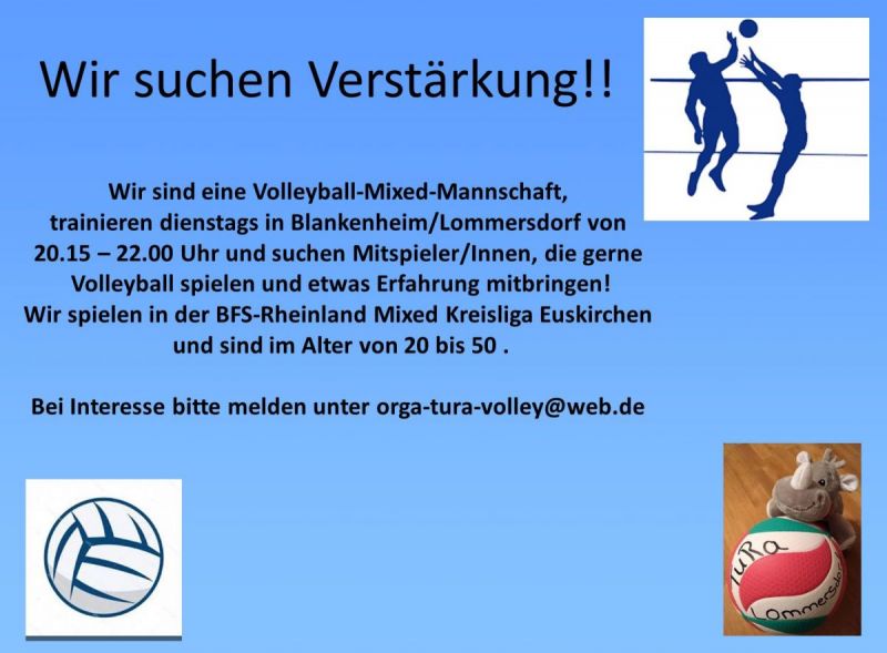 "Lust auf Volley-Ball?"...dann sind Sie bei der Volleyball-Mixed Mannschaft der TuRa Lommersdorf genau an der richtigen Stelle. Dort sucht man ständig Verstärkung für die gemischte Mannschaft, die in der BFS-Rheinland Mixed Kreisliga Euskirchen spielt. Einfach melden oder vorbeikommen.