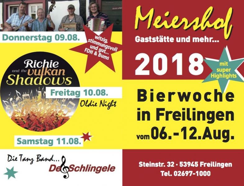 "Et ist Bierwoch, Käsper zapp an ! Et is Bierwoch, do john mer hin !"...Freunde der Freilinger Biergartenkulturtage können sich freuen, denn es ist wieder soweit: vom 6. bis 12. August 2018 steht wieder die schon legendäre Bierwoche im Biergarten der Gaststätte Meiershof in Freilingen auf dem Veranstaltungskalender, natürlich wieder mit eigener Bierwochenhymne von FDH & Bums!
