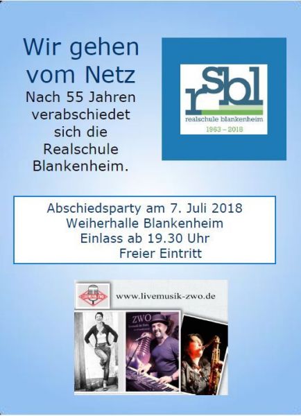 "Time to say goodbye" - nach 55 Jahren erfolgreichen Wirkens schließt die Realschule Blankenheim am Ende dieses Schuljahres endgültig ihre Pforten. Wenn dies auch unbestritten ein trauriges Ereignis ist, lässt es sich die Schule nicht nehmen, sich mit einem großen Abschiedsfest von Schülern, Eltern, Lehrern, aber auch allen "Ehemaligen" zu verabschieden, und zwar am Samstag, 07. Juli 2018 ab 19.30 Uhr in der Weiherhalle in Blankenheim.