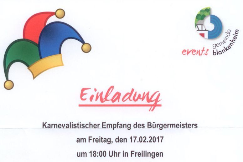 Seit einigen Jahren findet der Karnevalsempfang des Bürgermeisters nicht mehr wie früher im großen Ratssaal des Rathauses statt, sondern wird vielmehr abwechselnd auf den Dörfern veranstaltet, um die gemeindliche Verbundenheit zu demonstrieren. In diesem Jahr empfängt der Bürgermeister im Saal der Gaststätte Meiershof in Freilingen die Karnevalsjecken der Gemeinde, und zwar am Freitag, 17. Februar ab 18.00 Uhr.