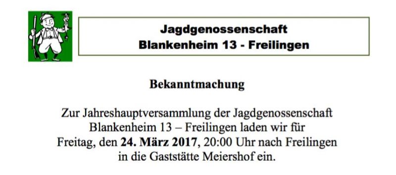 Zur diesjährigen Jahreshauptversammlung der Jagdgenossenschaft Blankenheim 13 - Freilingen am Freitag, 24.März 2017 um 20.00 Uhr lädt der Vorsitzende, Stefan Hermeling, alle Jagdgenossen in die Gaststätte Meiershof ein. Auf der Tagesordnung stehen u.a. die Beschlussfassung über die Höhe der Ausschüttung der Jagdpacht und der Haushaltsplan.