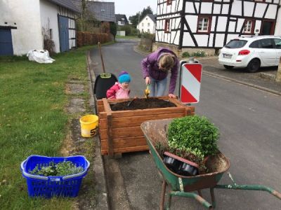 Mario Schwarz, Mitarbeiter der Nordeifel Werkstätten, hat die Kisten in der Mittagspause hergestellt, Schwiegervater Guido Bornemann hat sie angestrichen und mit Folie ausgekleidet und Ehefrau Esther und Nachwuchs Runa haben die vom Bauhof freundlicherweise verkehrssicher ausgestatteten und aufgestellten Kübel dann bepflanzt. Herzlichen Dank für die Mithilfe!