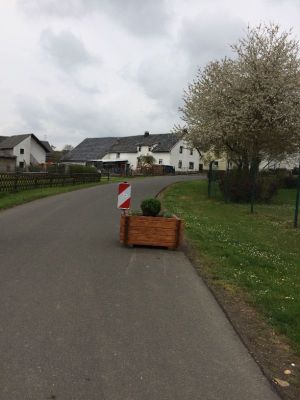 Die Aufstellung dieses Kübel ist im letzten Jahr auf Bitten der Anlieger initiiert worden, da in diesem Bereich viele kleine Kinder wohnen und die Fahrbahn über keinen Bürgersteig verfügt. Nach zweifachem Ortstermin mit Verkehrsschau mit Mitarbeitern des gemeindlichen Ordnungsamtes, Vertretern des Straßenverkehrsamtes des Kreises Euskirchen und der Kreispolizei im letzten Jahr, wurden nach Genehmigung der verkehrsberuhigenden Maßnahmen die Holzkisten von Anliegern der Anliegern der Industriestraße in einer Art Familienaktion her- und aufgestellt.