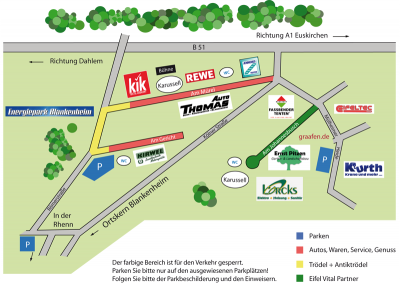 Ein Parkplatzproblem wird es nicht geben. Kostenlose Parkplätze stehen für die Besucher auf dem Parkplatz Ecke „Römerstraße" und „Am Gericht" sowie an der „Mülheimer Heide" oder „In der Rhenn" zur Verfügung. Einfach der Beschilderung folgen.