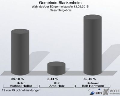 Michael Heller, der als parteiloser Kandidat von vier Fraktionen des Rates als Kandidat nominiert worden war (Bündnis 90/Die Grünen, CDU, FDP und UWV) erzielte gemeindeweit 39,1 %. Der dritte Anwärter auf den Bürgermeisterposten, der Einzelbewerber Arno Holz, konnte 8,5 % der Stimmen auf sich verbuchen. Die Wahlbeteiligung lag in der gesamten Gemeinde Blankenheim bei 61,3 %.