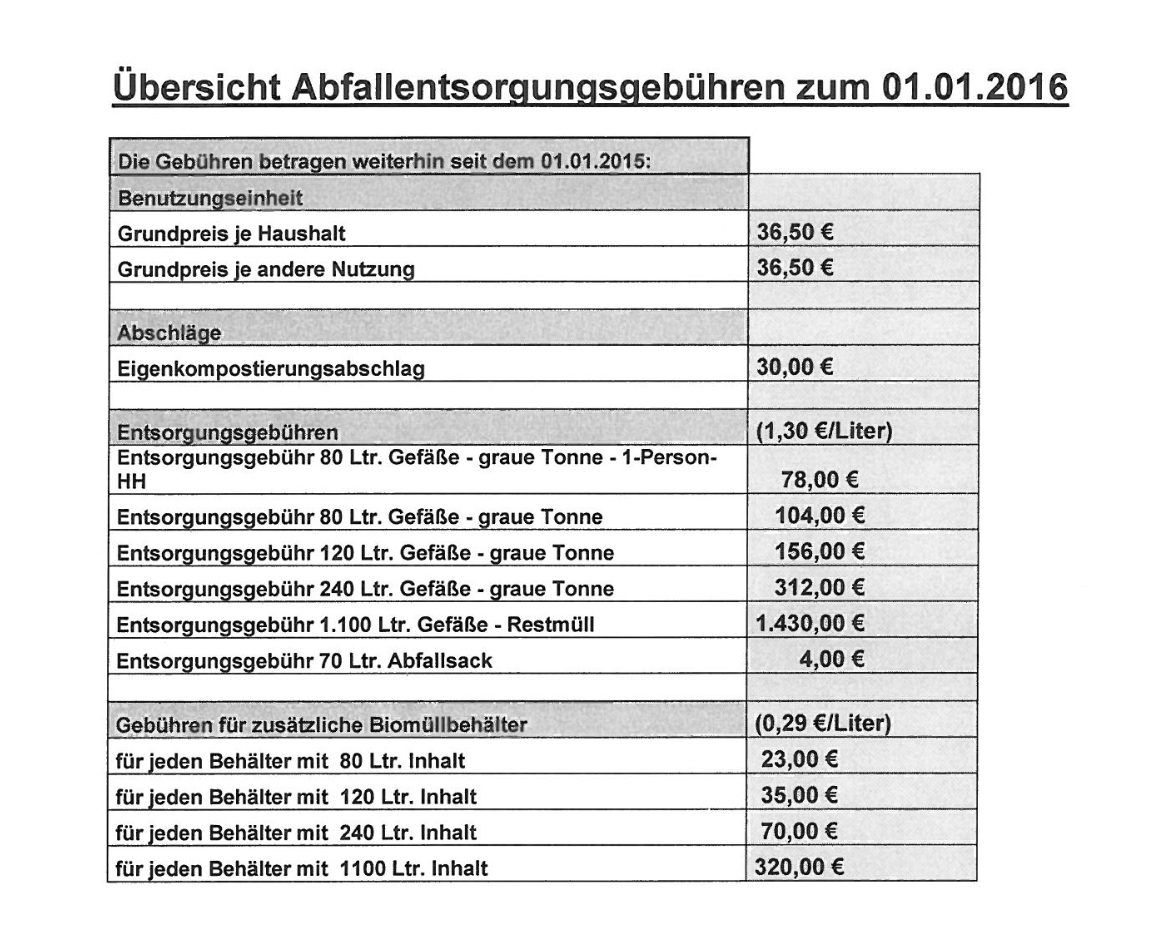 Die Berechnung für das Jahr 2016 hat ergeben, dass die Abfallentsorgungsgebühren unverändert bleiben.