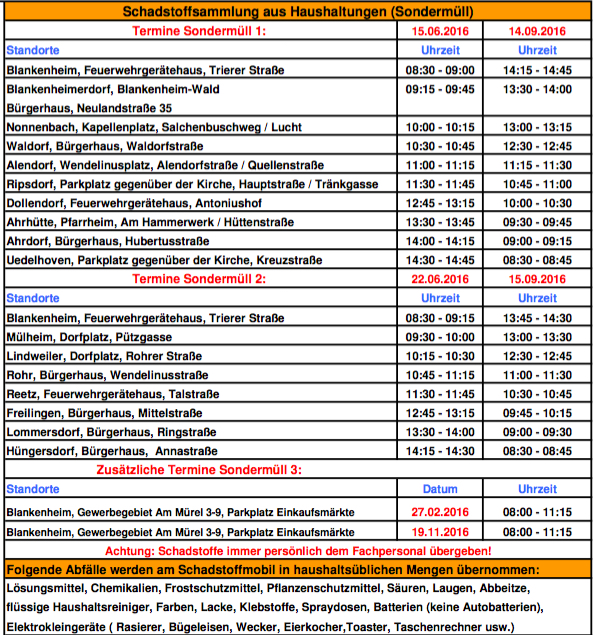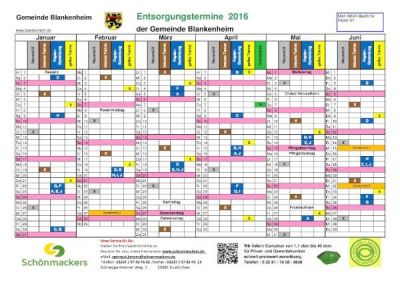 In diesem Jahr wird er erstmals nicht von den Ortsvorstehern verteilt, sondern flattert mit dem nächsten Bürgerbrief der Gemeinde ins Haus: der Abfallkalender 2016 der Gemeinde Blankenheim. Daraus kann man dann die Entsorgungstermine für das kommende Jahr entnehmen.