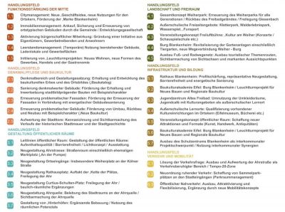 Heraus kam dabei der sog. Masterplan, eine umfassende Bestandsaufnahme und Analyse verbunden mit einer Ideensammlung zur Umgestaltung Blankenheims. Dieser Masterplan (Teil 1, Teil 2) wurde im Dezember 2014 im Rathaus den politischen Gremien und im Februar 2015 im Eifelmuseum auch der Bevölkerung vorgestellt.
