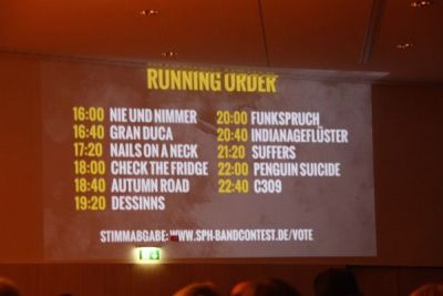 Gute Voraussetzungen für die Eifler Band "Penguin Suicide" und deren Anhänger, am vergangenen Samstag bei zeitweise winterlichen Sraßenverhältnissen den weiten Weg von der Eifel in den Westerwald anzutreten. In Montabaur fand das achte Deutschland-Finale des SPH-Bandcontests statt, einer der größten Nachwuchswettbewerbe Europas. Die Pinguine hatten sich neben zehn anderen Bands nach drei Vorrundenauftritten im Frühjahr und Herbst letzten Jahres in Köln für dieses Finale qualifiziert.