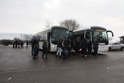 Circa 100 Fans starteten gegen 15 Uhr von Lommersdorf aus in zwei großen Reisebussen. Im Gepäck unter anderem für Pinguine eher ungewöhnliche Flüssignahrung, Käsewürfel und Mettwürstchen.