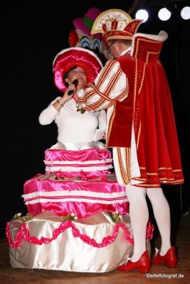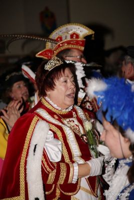 Dann kam der Tag der Freilinger Sitzung und damit unserer Proklamation. Vor Sitzungsbeginn stieg langsam die Nervosität und ich wunderte mich, warum Käsper denn den Saal wie eine Sauna aufgeheizt hatte. Zumindest hatte ich das Gefühl, dass mir der Schweiß in Strömen den Rücken runter lief. Kurz vor der Sitzung ging es dann hoch ins Wohnzimmer von Ingrid und Käsper zum Umziehen und da kam die Nervosität richtig durch. Ich bekam den Reißverschluss an Rosis Kleid nicht zu, aber zum Glück war Verena in der Nähe und konnte helfen.