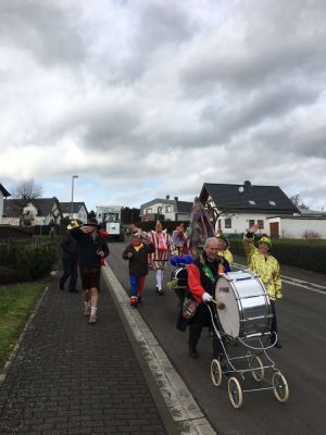 Am Karnevalssamstag stand dann zum dritten Mal unser kleiner Karnevalszug durch Freilingen auf dem Programm, an dem dieses Mal bei echtem Prinzenwetter um die fünfzig Teilnehmer dabei waren und sogar der große Wagen der „Invasion aus Freilingen“.