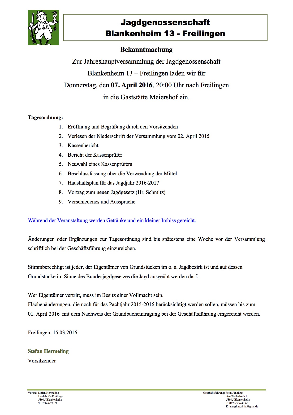 Zur diesjährigen Jahreshauptversammlung der Jagdgenossenschaft Blankenheim 13 - Freilingen am Donnerstag, 7.April 2016 um 20.00 Uhr lädt der Vorsitzende, Stefan Hermeling, alle Jagdgenossen in die Gaststätte Meiershof ein.
