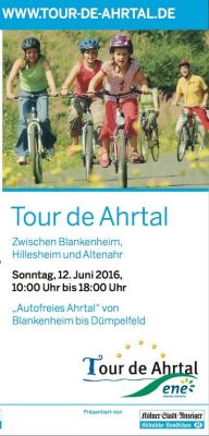 Am Sonntag, 12. Juni 2016 startet sie wieder, die "Tour de Ahrtal" zum mittlerweile 12. Mal und stellt inzwischen "Das" Radsportevent in der Eifel und im Ahrtal dar. Der Radaktionstag besticht dabei nicht nur durch seine wundervolle Naturlandschaft, sondern auch durch zahlreiche Aktionspunkte entlang der Strecke mit einem bunten Unterhaltungs-, Musik-, Gastronomie- und Informationsangebot für Groß und Klein.