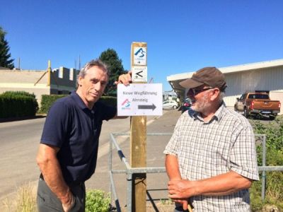 Dies machte es jetzt erforderlich, auch die Beschilderung der neuen Strecke anzupassen und einen Hinweis auf die geänderte Wegeführung anzubringen, wobei Heinrich Bertram tatkräftige Unterstützung von Hans-Josef Hüllbüsch bekam, Mitarbeiter der Gemeinde Blankenheim im Fachbereich III und bisher u.a. zuständig für Angelegenheiten des Wander- und Radwegenetzes in der Gemeinde, demnächst allerdings nur noch als Ruheständler auf den verschiedenen Wander- und Radrouten anzutreffen.