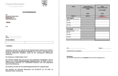 In den vergangenen Wochen sind den Grundstückseigentümern in der Gemeinde Blankenheim mit einem erläuternden Anschreiben vorbereitete Kaufverträge übermittelt worden, mit denen die Gemeinde das Angebot übermittelt hat, die im Eigentum der Grundstückbesitzer befindlichen Rest- und Biomülltonnen zurückzukaufen. Der Kaufvertrag muss bis zum 31. August 2016 zurückgesendet werden. Anderenfalls verbleiben nach Fristablauf die Tonnen zwar im privaten Eigentum, können dann aber dennoch nicht mehr für den Abtransport des Hausmülls verwendet werden!