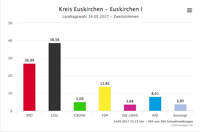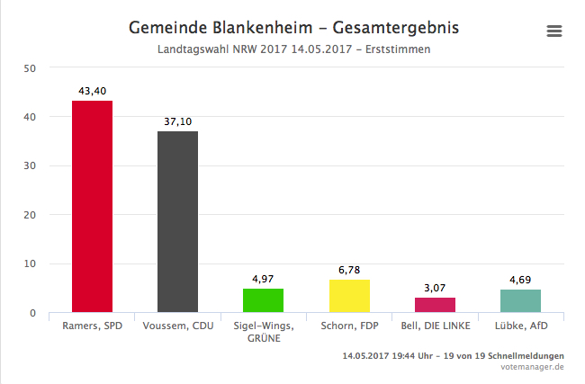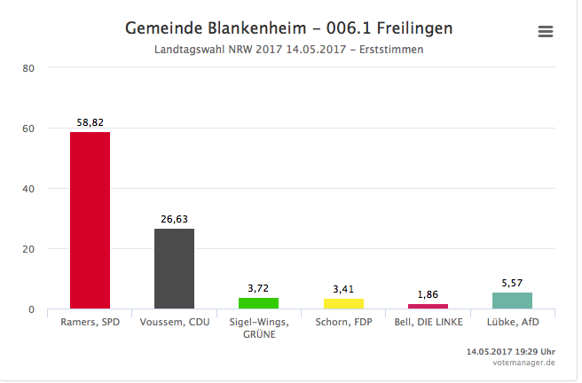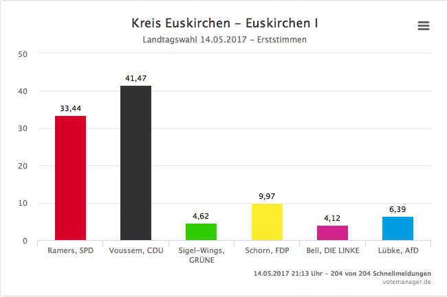 Damit konnte sich Markus Ramers (SPD) leider nicht als Direktkandidat durchsetzen und Klaus Voussem (CDU) zieht als Direktkandidat für den Wahlkreis Euskirchen I in den nordrhein-westfälischen Landtag ein. Unbestritten hat er aber einen sehr engagierten, zeitaufwendigen und professionellen Wahlkampf geführt. Respekt !!!