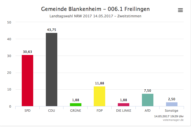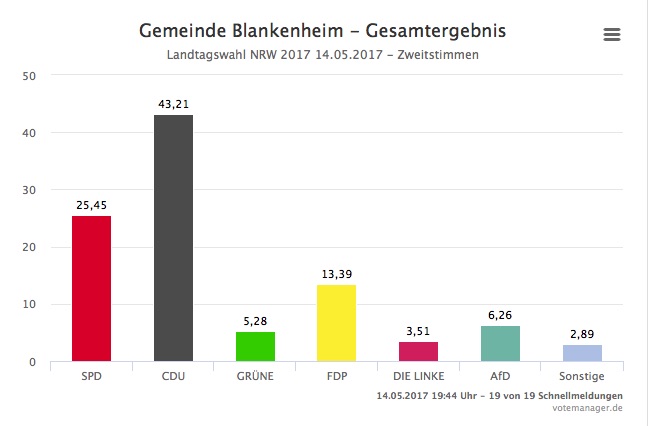 Die Landtagswahl ist gehalten...NRW und damit auch die Freilinger haben gewählt. Auch wenn Markus Ramers in seinem Heimatort bzw. seiner Heimatgemeinde Blankenheim eine klare Mehrheit gewinnen konnte, hat er leider den Sieg im gesamten Wahlkreis und damit den Einzug in den Düsseldorfer Landtag trotz eines sehr engagierten Wahlkampfes verpasst. Hier die Ergebnisse.