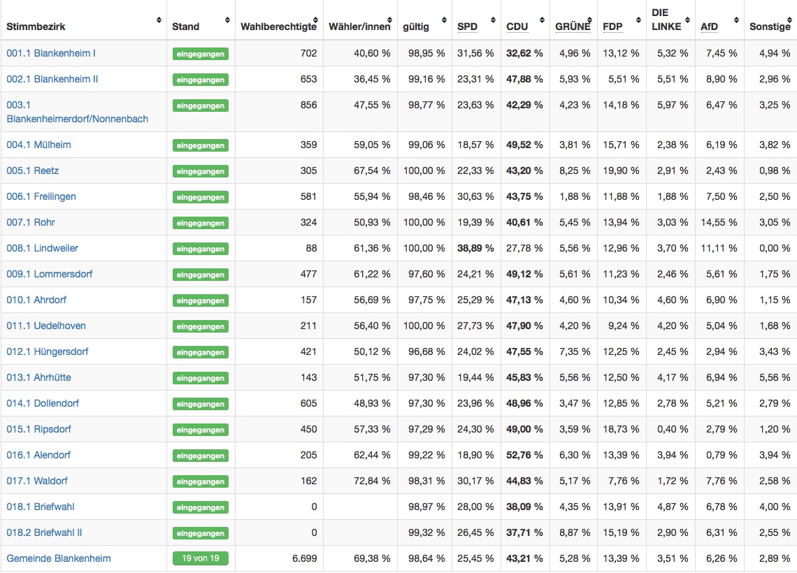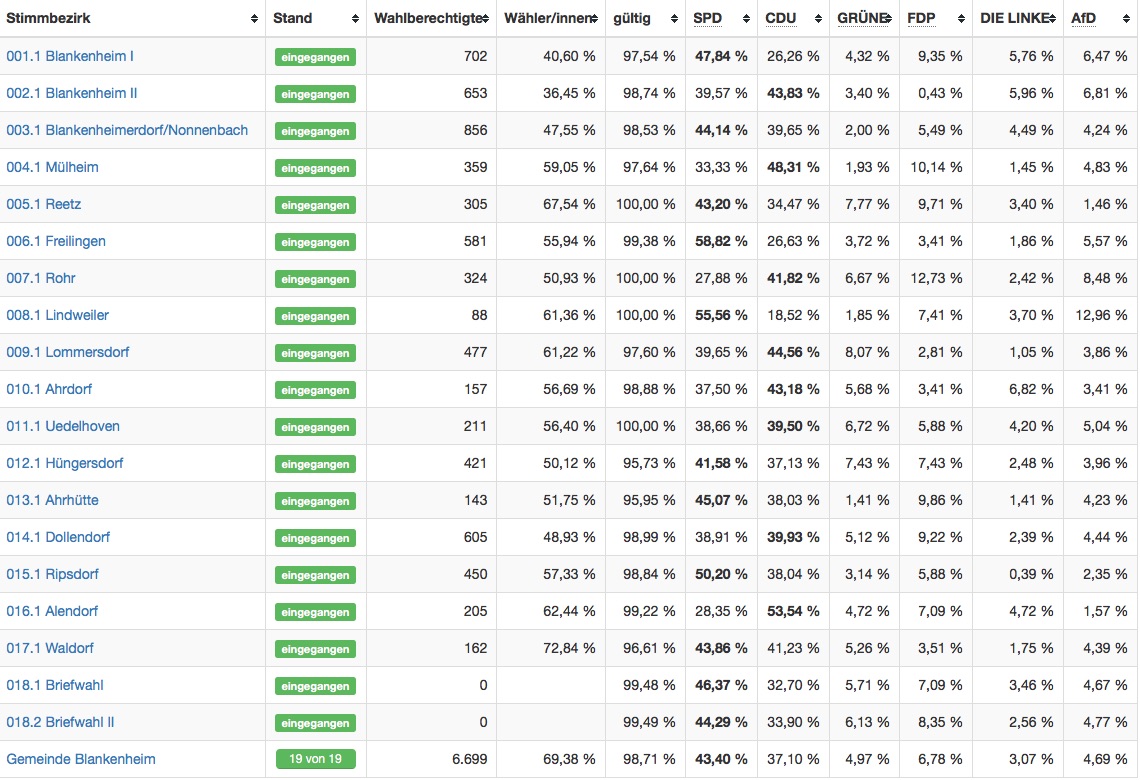 Insgesamt wurde in der Gemeinde Blankenheim bei einer insgesamten erfreulichen Wahlbeteiligung von 69,38 % der insgesamt 6.699 Wahlberechtigen folgende Erststimmen abgegeben: