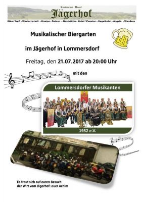 Was gibt es im Sommer schöneres, als bei unterhaltsamer Musik im Biergarten zu sitzen...das hat man sich auch im Lommersdorf gedacht und kurzer Hand für Freitag, 21. Juli 2017 im Biergarten des Jägerhofes zusammen mit den Lommersdorfer Musikanten einen musikalischen Abend in gemütlicher Gartenatmosphäre geplant.