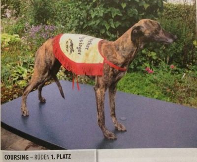 Ein Nachwuchs aus dem Hause Steenbergen ist besonders schnell und geschickt: Lucky Lad, 3 Jahre alter Rüde. Erst im Herbst letzten Jahres gewann er die deutsche Coursing-Meisterschaft seiner Klasse und wurde mit der entsprechenden Siegerdecke festlich geschmückt.