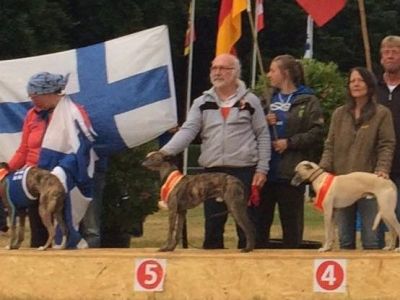 Rund 850 Hunde aus 22 Ländern waren bei diesem internationalen Wettkampf an 3 Tagen im Einsatz und hatten anspruchsvolle Parcours zu bewältigen. Gleich 5 Coursingrichter bewerteten dabei die einzelnen Läufe. An den Rennen der Whippet-Rüden (beim Wettkampf laufen die "Damen und Herren" streng getrennt!) nahmen insgesamt 61 Hunde teil. Mit einer Gesamtpunktzahl von 882 landete Lucky Lad nach zwei Durchgängen als bester von 6 deutschen Teilnehmern auf dem hervorragenden 5. Platz und durfte daher zusammen mit dem Europameister "Hugo Discobolos" aus Tschechien (Gesamtpunktzahl von 891 Punkten), gegen den er auch im zweiten Durchgang antreten musste, auf der Siegertreppe Aufstellung nehmen.